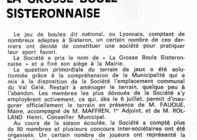 Après le départ des joueurs de tennis, c’est finalement la Grosse Boule Sisteronaise (GBS) qui investit les lieux au début des années 1970. Cette association est initialement présidée par Jean Gravier, directeur des contributions financières à Sisteron, et son siège est officiellement fixé en mairie. Elle a été fondée en juillet 1969 pour favoriser la pratique du jeu de boules ou jeu national également appelé boules lyonnaises, car cette discipline a vu le jour dans la ville rhodanienne au XVIIIe siècle. Le terrain est plus long (entre 12m 50 et 17m 50 hors espace d’élan) et les boules plus lourdes (entre 900 et 1 200g) qu’à la pétanque. L’objectif final est le même, se rapprocher le plus possible du but ou petit, mais ce dernier doit être au départ lancé dans une zone précise longue de 5 m où se déroule le jeu. Par ailleurs, la boule lancée par les tireurs doit par exemple impérativement atterrir dans un arc de cercle de 50 cm autour de la boule tirée pour que le coup soit considéré comme valable. Si ce n’est pas le cas, l’équipe adverse peut accepter le coup ou au contraire remettre boules et but à leurs places initiales. Il existe un important club de boules lyonnaises à Gap, mais à Sisteron l’essor de cette pratique sportive est plus récent, puisqu’il est concomitant de l’arrivée des rapatriés d’Algérie après 1962. Le nouveau club rassemble toutefois, dès ses débuts, plus de quatre-vingts membres.
