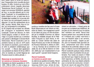 Au terme des travaux de remise à neuf, le boulodrome du Val Gelé est inauguré, le 30 mai 2018, et prend le nom de Marcel Coudoulet joueur émérite et dirigeant dévoué décédé l’année précédente. La journée d’hommage débute par le « Challenge Marcel Coudoulet », mettant aux prises seize quadrettes de vétérans, et remporté par des sociétaires de la Grosse Boule Sisteronaise. En fin d’après-midi une plaque commémorative est dévoilée par le maire de Sisteron Daniel Spagnou en présence de la famille et des amis de Marcel Coudoulet. Elle honore la mémoire de celui qui fut secrétaire, trésorier puis président de la Grosse Boule Sisteronaise et a largement contribué au développement de cette association bouliste. Licencié au club depuis 1974, ce Sisteronais a par ailleurs été sacré champion de Provence doublette à Istres en 1993 et champion de Provence Nationale 4 en 2007. Il a eu, en outre, l’honneur de représenter les Alpes du Sud au Championnat de France. Son palmarès compte également quatre titres de champion de district quadrette (1974, 1995, 1996 et 2005). Comme dirigeant, Marcel Coudoulet a par ailleurs œuvré à la promotion du sport-boules à l’échelle départementale et régionale. Vice-président du district Alpes-de-Haute-Provence Hautes-Alpes de 2004 à 2012, il a également siégé durant la même période au comité régional de Provence. Ce parcours sportif et cet engagement de tous les instants au service de son sport ont été salués par l’attribution de la médaille d’argent de la Fédération française du Sport-Boules. Il a aussi reçu la médaille d’honneur du district bouliste, celle du Conseil général des Alpes-de-Haute-Provence et, en octobre 2008, la médaille d’or de la ville de Sisteron.