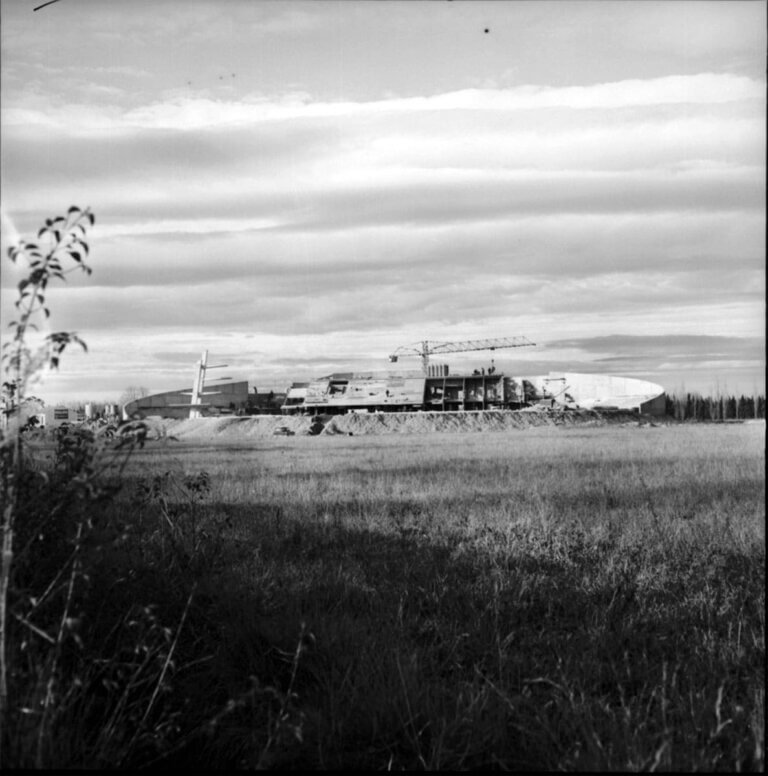 Cette photographie prise au début des années 1960 lors de la construction de la nouvelle piscine municipale d’Avignon montre que le nouvel équipement aquatique a été construit au milieu des champs au Sud-Est de la ville à Saint-Chamand. Le futur stade nautique, qui sera mis en service en 1966 et inauguré en 1967, fait partie intégrante de la ZUP Sud et constitue le premier élément d’un plus vaste complexe sportif, qui comprendra aussi le stade d’honneur de la ville aménagé entre 1967 et 1969.