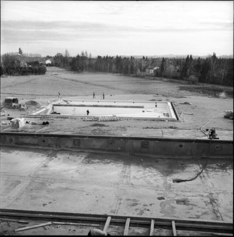 La nouvelle piscine municipale d’Avignon, encore en construction et qui sera mise en service en juillet 1966, comporte un bassin de 50 m et un bassin de 25 m ainsi qu’une fosse de plongée surplombée d’un plongeoir à 4 tremplins.