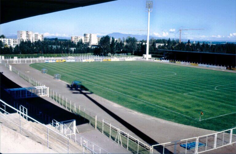 Prise en octobre 1987, cette photographie du stade du Parc des Sports d’Avignon (construit entre 1967 et 1969) permet de constater qu’il est muni de deux tribunes, d’une piste d’athlétisme et d’un système d’éclairage. En arrière-plan, on aperçoit les immeubles de la ZUP de Saint-Chamand. Au sein du même complexe sportif se trouve également une piscine non couverte à l’architecture remarquable mise en service en 1966 et inaugurée l’année suivante.