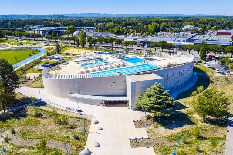 Fermé en 2010 et laissé de longues années à l’abandon, le stade nautique d’Avignon a été totalement réhabilité à partir de 2018. Sur la gauche de l’image, on aperçoit la nouvelle plaine des sports, inaugurée en 2019.