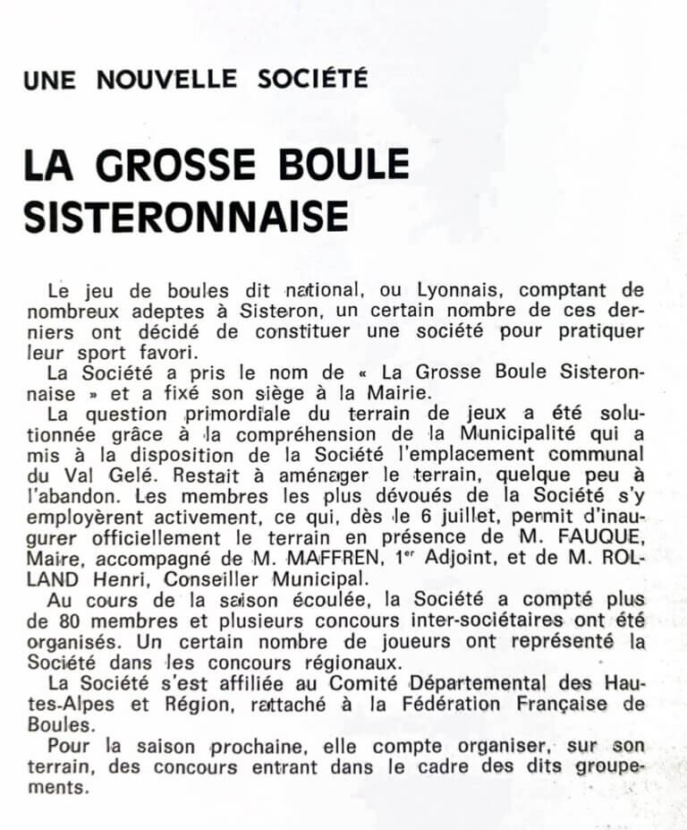 La Grosse Boule Sisteronaise (GBS), dont le siège est fixé en mairie, est née officiellement en juillet 1969 et son premier président se nomme Jean Gravier. Ce club a vu le jour pour pratiquer le jeu de boules ou jeu national également appelé boule lyonnaise. Cette pratique sportive a en effet connu un essor à Sisteron avec l’arrivée des rapatriés d’Algérie. Après le départ du Tennis Club Sisteronais, la municipalité met à sa disposition le terrain du Val Gelé qui est remis en état grâce aux efforts des membres de l’association. Le nouveau boulodrome est officiellement inauguré, le 6 juillet 1970, en présence du maire de Sisteron, Élie Fauque, accompagné de son premier adjoint Daniel Maffren.