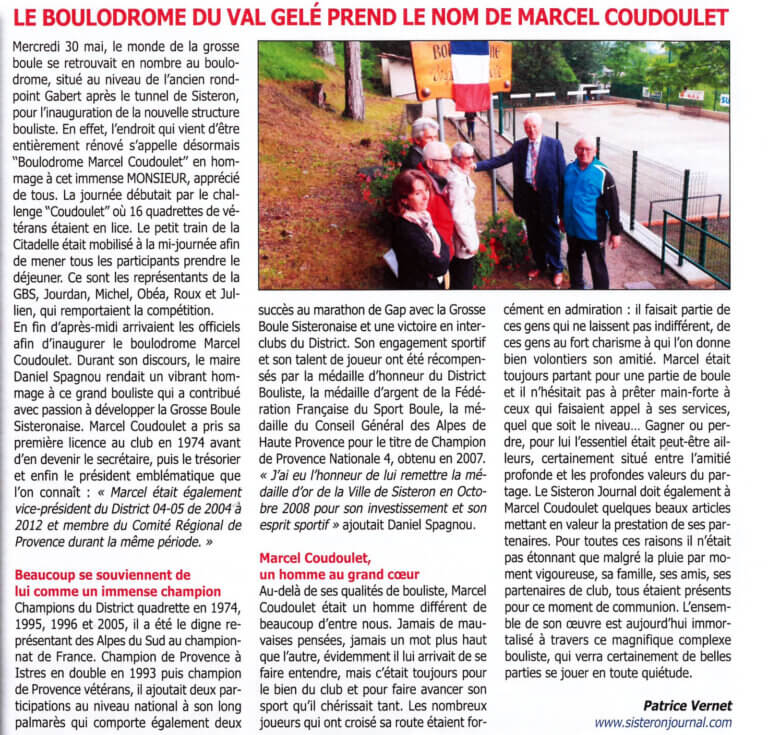 Le 30 mai 2018 à l’occasion de l’inauguration du boulodrome rénové du Val Gelé à Sisteron, cet équipement sportif prend le nom de Marcel Coudoulet, décédé l’année précédente. La municipalité entend rendre hommage et honorer la mémoire de ce dirigeant dévoué et joueur émérite, licencié à la Grosse Boule Sisteronaise (GBS) depuis 1974 et dont il fut successivement secrétaire, trésorier puis président. Une plaque commémorative est dévoilée par le premier édile Daniel Spagnou en présence de la famille et des amis de l’intéressé ainsi que de membres du monde sportif local. Avant cette cérémonie officielle, la journée a été consacrée au « challenge Marcel Coudoulet », mettant aux prises seize quadrettes de vétérans, et remporté par des sociétaires de la Grosse Boule Sisteronaise.