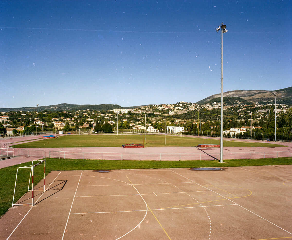 Le stade Louis Perdigon à Grasse comprend un terrain engazonné permettant de jouer au rugby ou à d’autres sports collectifs. Cette pelouse est entourée d’une piste d’athlétisme munie d’aires de saut. Au premier plan se trouve un plateau d’évolution asphalté permettant par exemple de jouer au handball.