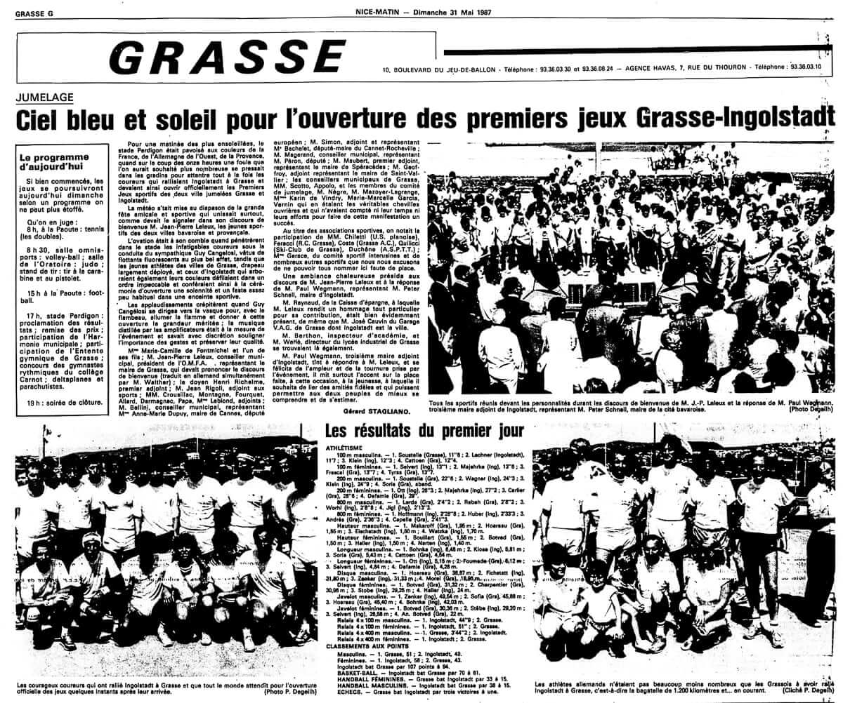 Le 30 mai 1987, le stade Louis Perdigon est le théâtre de la journée d’ouverture des premiers Jeux sportifs Grasse Ingolstadt. Ces derniers se déroulent dans le cadre du jumelage existant entre la ville des Alpes-Maritimes et la ville bavaroise depuis 1963. Le but est de faire se rencontrer la jeunesse française et allemande lors d’un événement sportif festif. Les rencontres se poursuivent le lendemain.