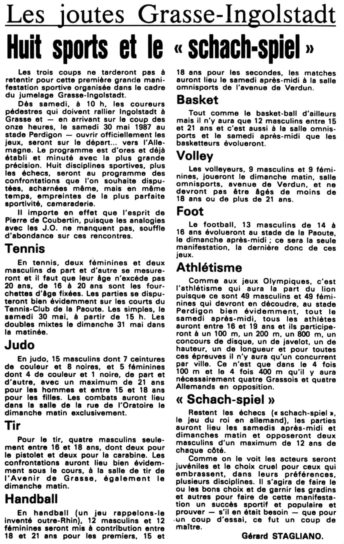Les 30 et 31 1987 sont organisés les premiers Jeux sportifs Grasse Ingolstadt. Ces derniers se déroulent dans le cadre du jumelage existant entre la ville des Alpes-Maritimes et la ville bavaroise depuis 1963. De nombreux sports sont au programme pour se faire se rencontrer la jeunesse française et allemande : tennis, judo, tir, handball, basketball, volley-ball, football, athlétisme et même des parties d’échecs. Le stade Louis Perdigon sert pour la cérémonie d’ouverture et les épreuves d’athlétisme ainsi que des démonstrations de gymnastique.