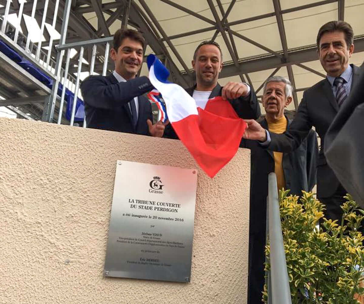 Le 20 novembre 2016, le maire de Grasse, Jérôme Viaud, dévoile la plaque inaugurative de la nouvelle tribune couverte du stade Louis Perdigon. Il est accompagné d’Éric Berdeu, président du Rugby Olympique de Grasse (ROG), et de Charles Ange Ginésy, président du conseil général des Alpes-Maritimes.