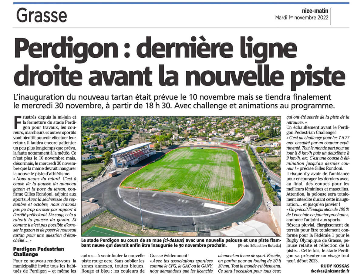 Début novembre 2022, des travaux sont encore en cours au stade Louis Perdigon à Grasse pour terminer de poser le nouveau revêtement de la piste d’athlétisme et achever la pousse du gazon du terrain de rugby élargi, afin que le Rugby Olympique Club de Grasse (ROG) puisse tenir son rang en Nationale 1 en évoluant dans un stade aux normes.