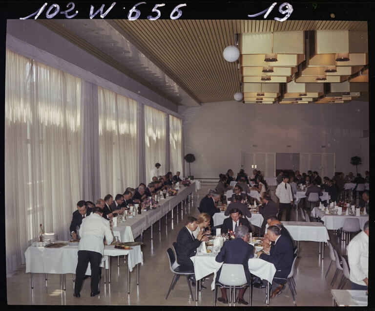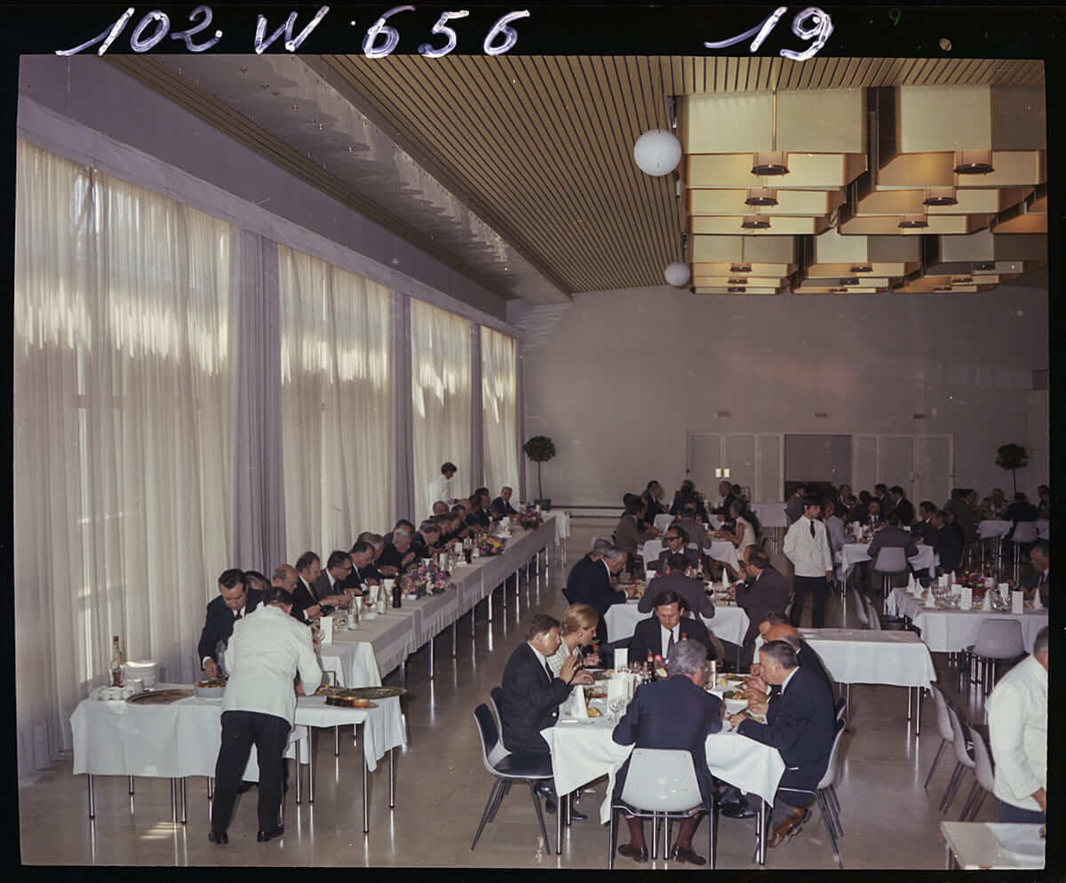 Le 27 mai 1972, un repas est servi aux invités à l’inauguration de la piscine municipale du Port-Marchand à Toulon dans les locaux de cet établissement sportif.
