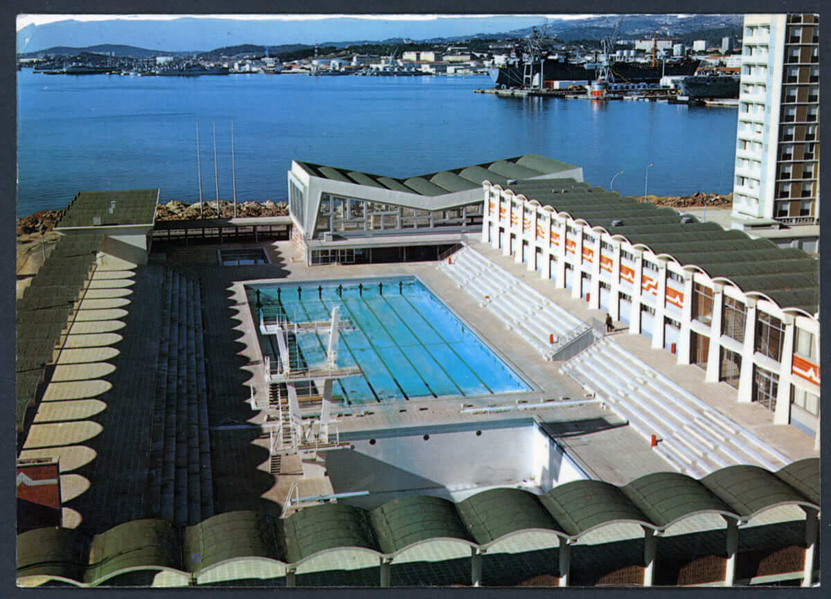 Cette vue aérienne de la piscine du Port-Marchand à Toulon, inaugurée en 1972, permet de constater sa proximité avec la rade de Toulon. Cet équipement nautique comprend un bassin intérieur et un bassin extérieur de 50 m chauffé et muni d’un plongeoir et de tribunes. Cette construction, réalisée par l’architecte varois Alfred Henry, constitue enfin un geste architectural de premier ordre, comme en témoigne par exemple le toit en forme d’aile d’oiseau du bassin intérieur.