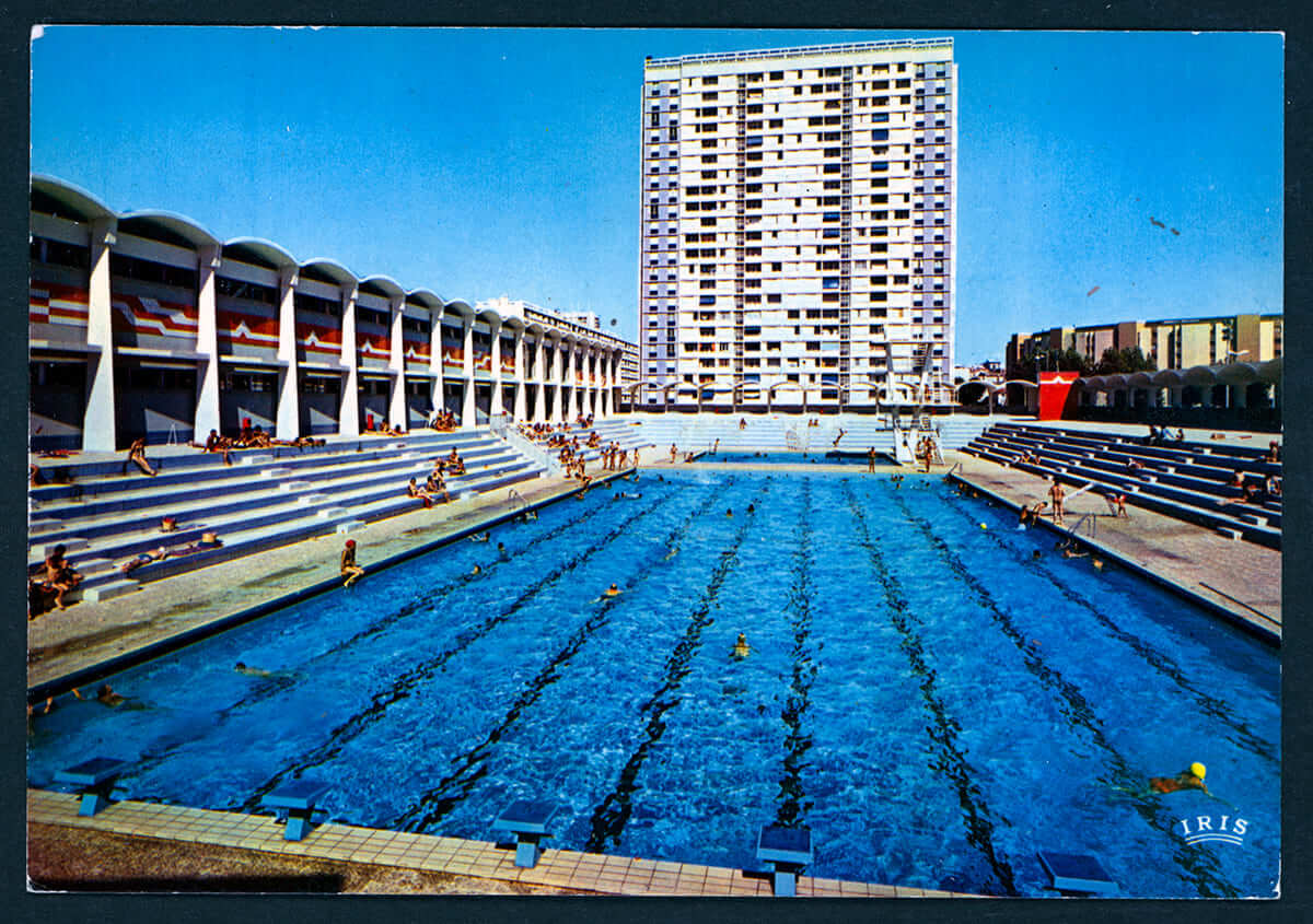 Le bassin extérieur de la piscine du Port-Marchand à Toulon est d’une longueur de 50 m. Il est aussi muni d’un plongeoir (détruit par la suite) de tribunes où les nageurs peuvent se reposer et bronzer.